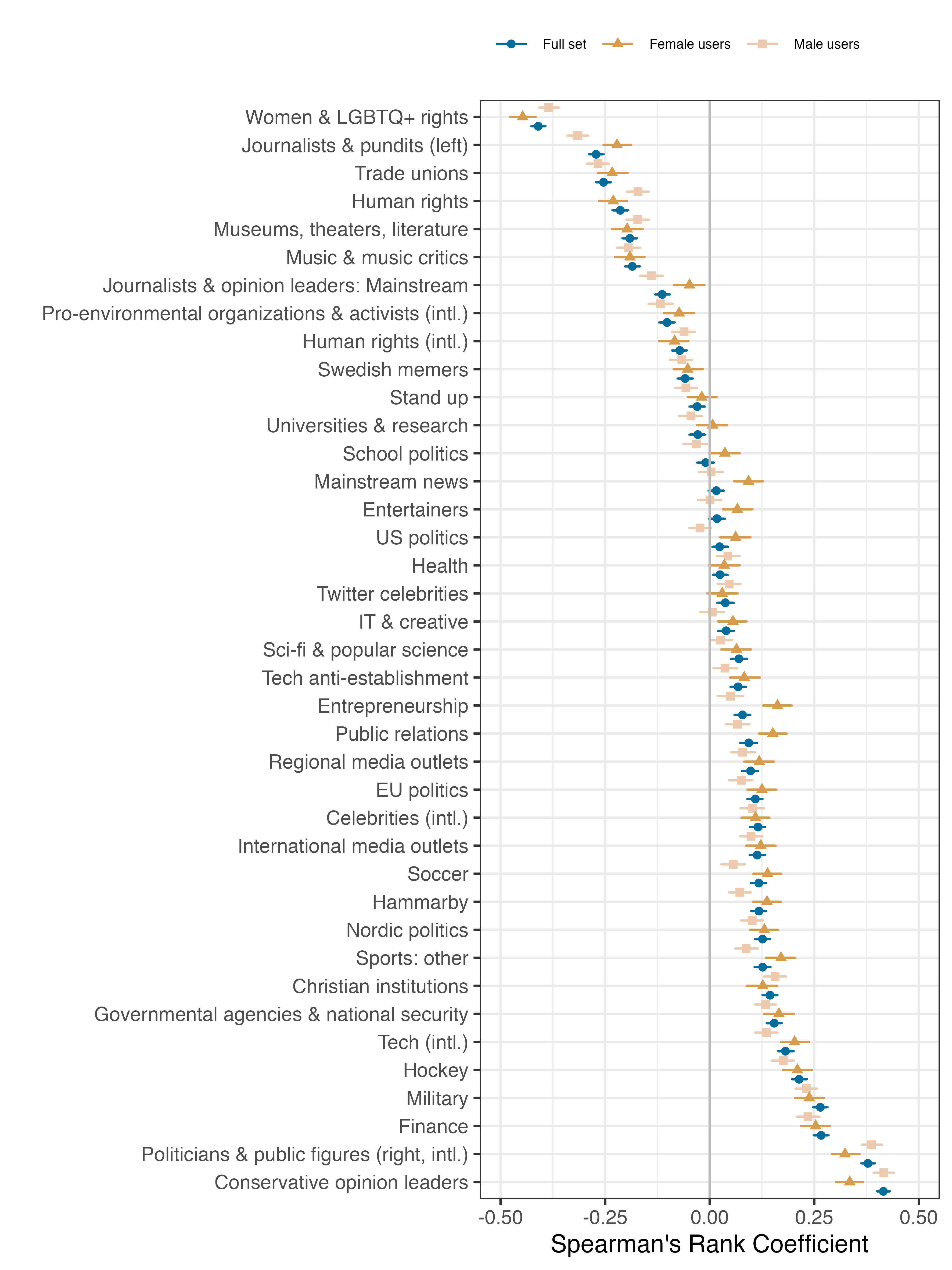 Political affiliation predicts a lot more than just policy preferences. Swedish voters’ media consumption, cultural interests, religious views, and even their sense of humor cluster along partisan lines. Left-leaning users follow human rights organizations, environmental groups, museums, and progressive journalists. Right-leaning users follow different content entirely: finance accounts, sports, military/security topics, and conservative commentators – even when those accounts have nothing explicitly political about them. This is also hardly affected by gender.